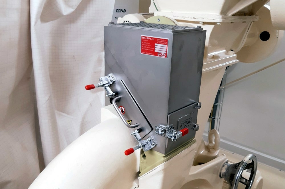 Aplikácia: Zákazník požadoval inštalovať silný magnetický separátor na vopred určené miesto – za násypku, z ktorej sú strukoviny a olejniny odoberané skrutkovým dopravníkom. Toto umiestnenie vopred vylúčilo použitie štandardných magnetických separátorov a vyžiadalo si navrhnutie špeciálneho magnetického separátora. Na rozdiel od obvyklých zákazníckych úprav, ktoré pre našich zákazníkov bežne robíme (ako úprava pripojovacích rozmerov, zmena stavebnej výšky, rozmerová úprava existujúcich separátorov a pod.), bolo tu potrebné navrhnúť nový typ magnetického separátora, aby spĺňal všetky požiadavky zákazníka.